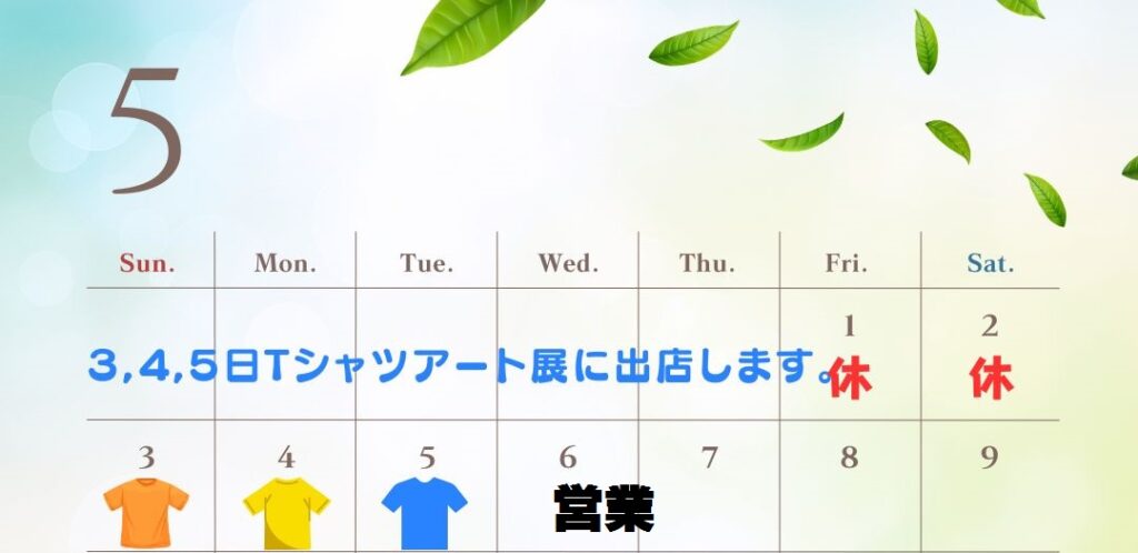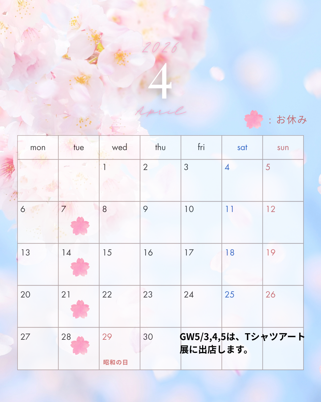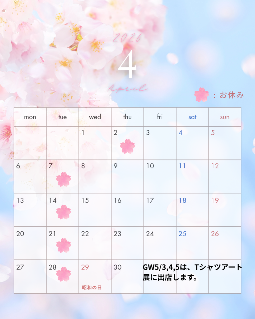 4月とGWなどの営業日のお知らせ 未分類 Facebook LINE コピー 2026.03.30 スタッフ個別のお休み、臨時休業する日など、また変更がありましたら、更新します。3/30現在 今のところの予定となります。 5/3~5 Tシャツアート展に出店しています。遊びに来てね!